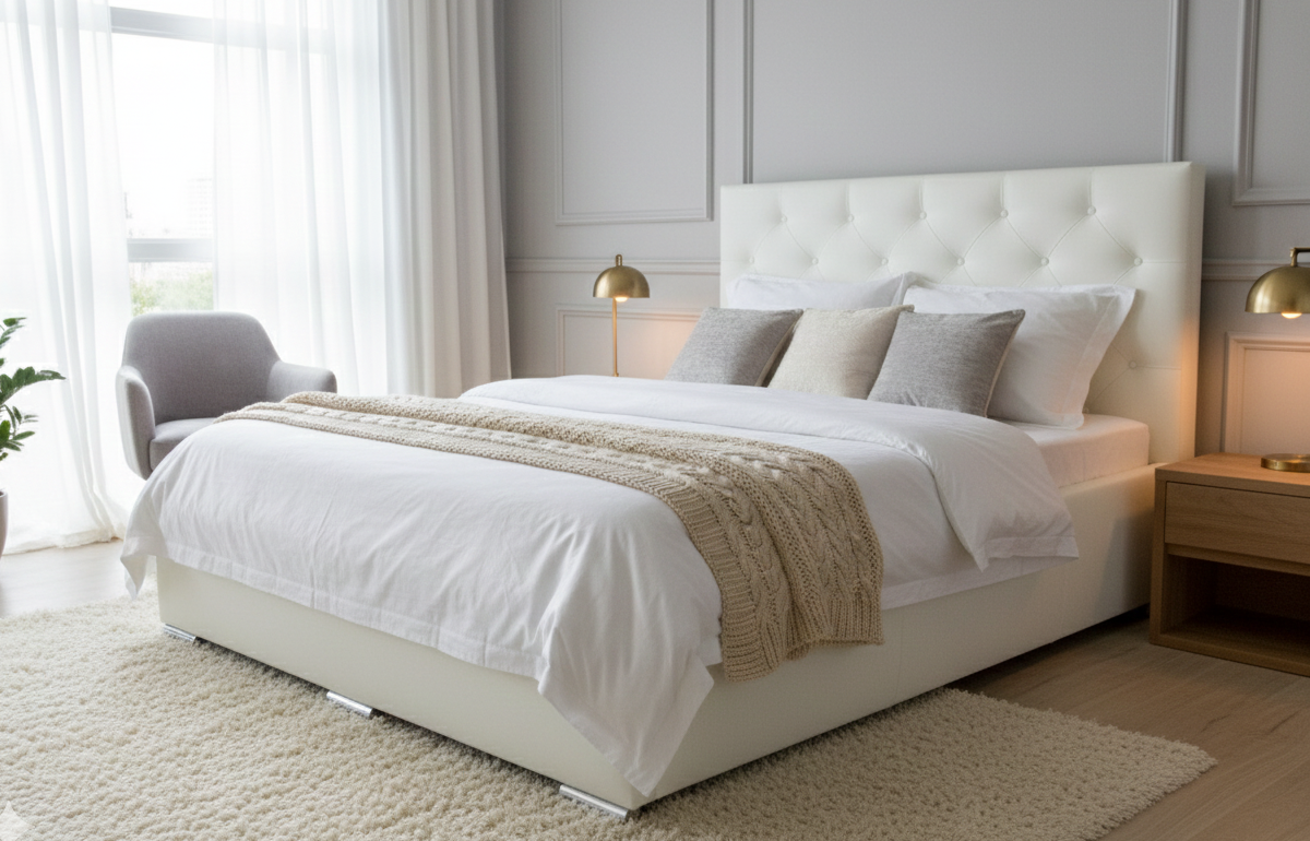 DIVA – upholstered bed with straight geometric lines on the headboard. This bed will fit perfectly into modern interiors and will also suit minimalist, high-tech and loft styles.